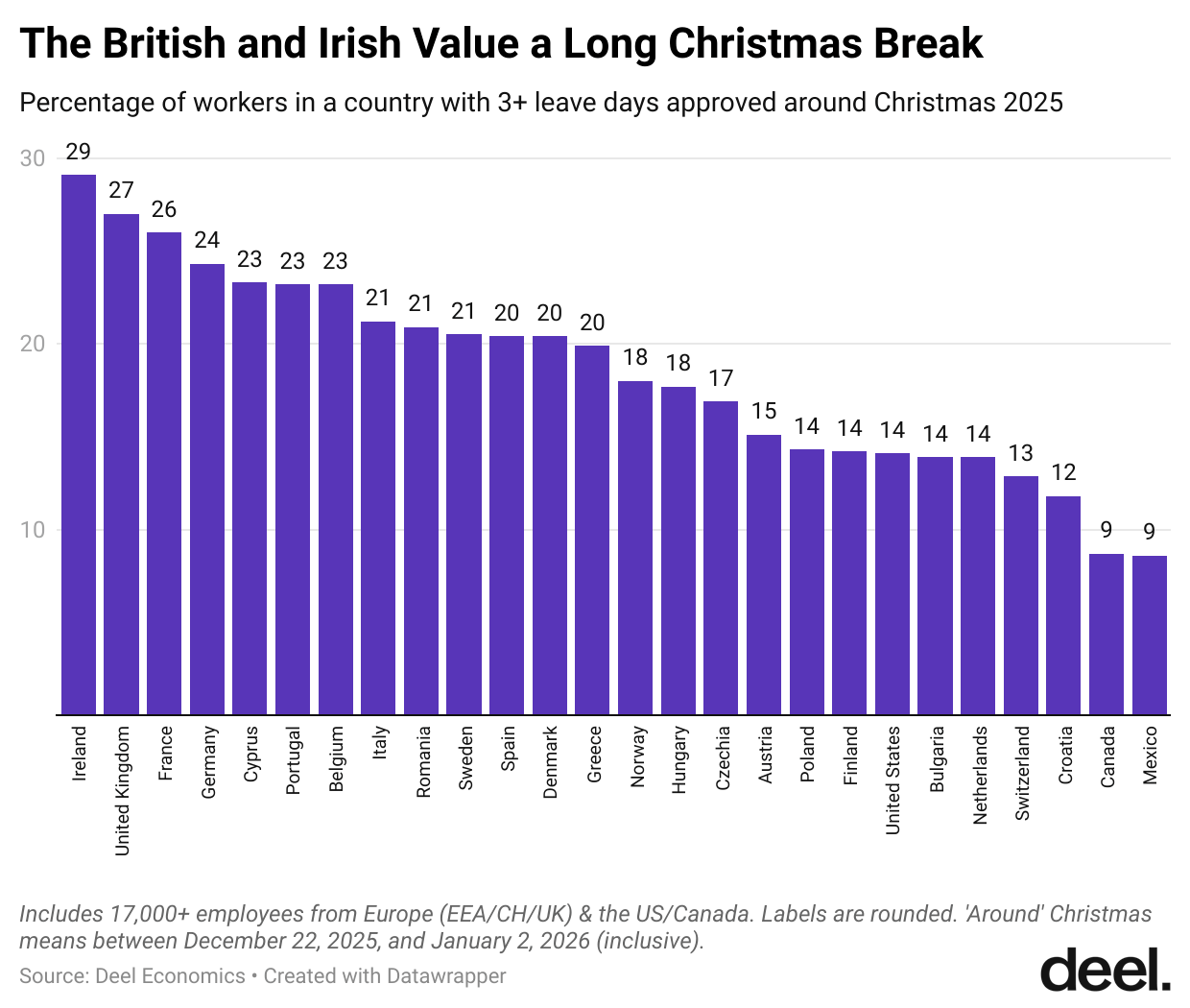 The British and Irish take their Christmas leave very seriously: 28.8% of Irish workers and 27.0% of British ones already have three days of annual leave between Christmas and New Year’s booked.