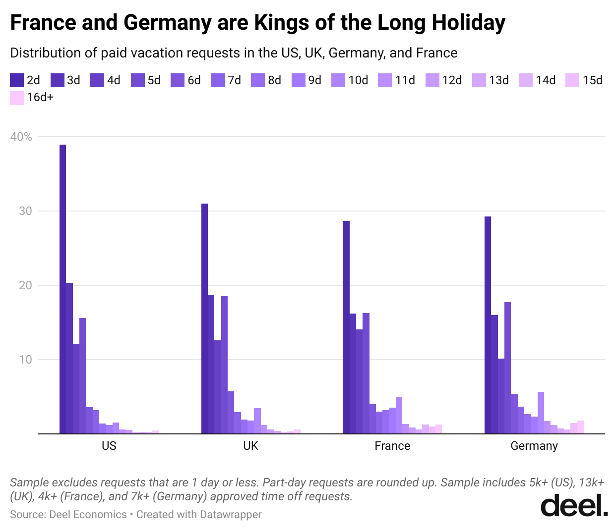 Germany and France are kings of the ‘long holiday’: After excluding one-day leaves (the majority of leave requests), 1.3% of French and 1.8% of German approved leaves were for 16 or more days, compared to 0.6% for the U.K. and 0.5% for the U.S.