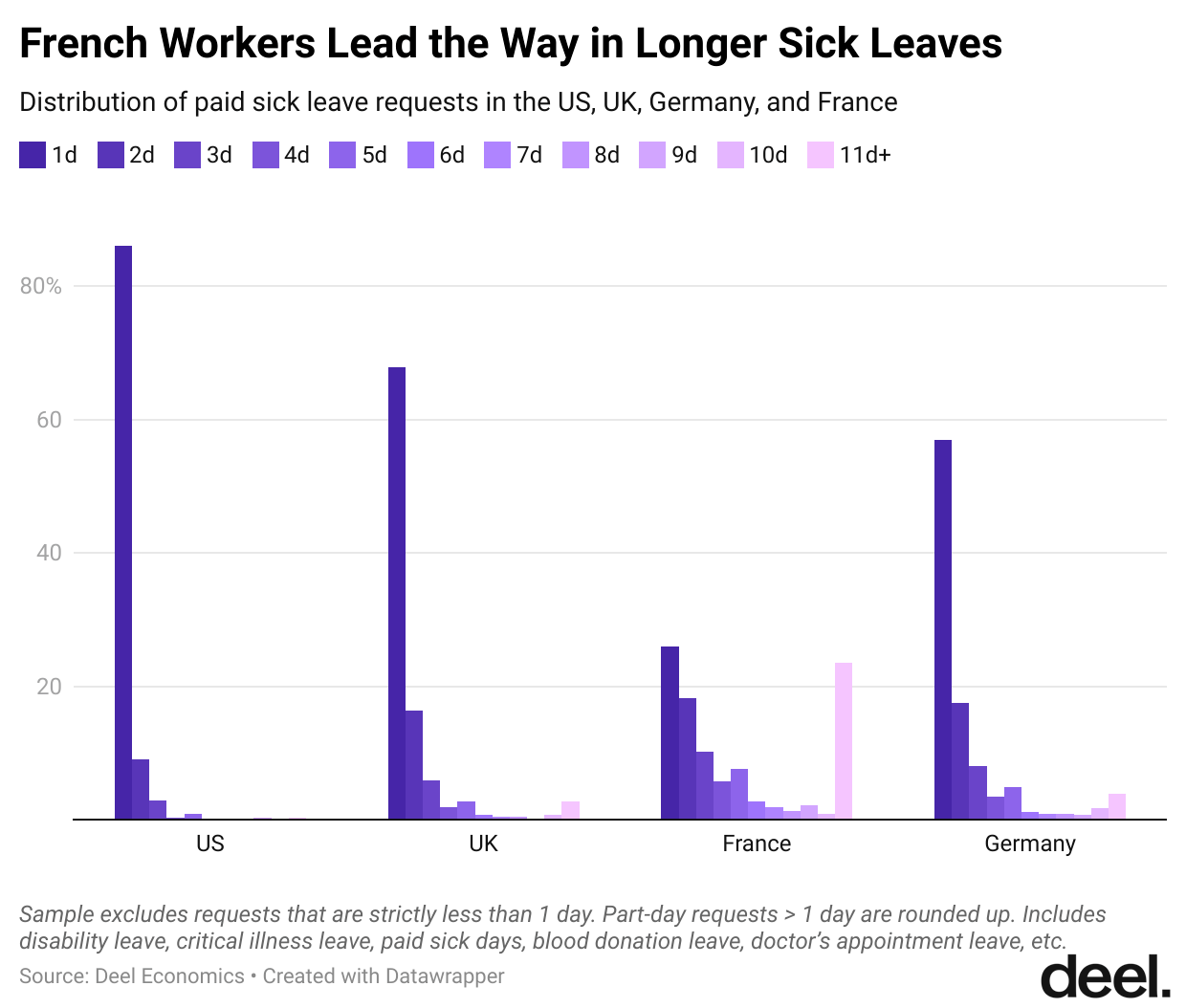 The French lead the way in longer sick leave: Nearly a quarter of approved French sick leave requests are for 11 or more days, compared to 4% of German and 3% of British requests.